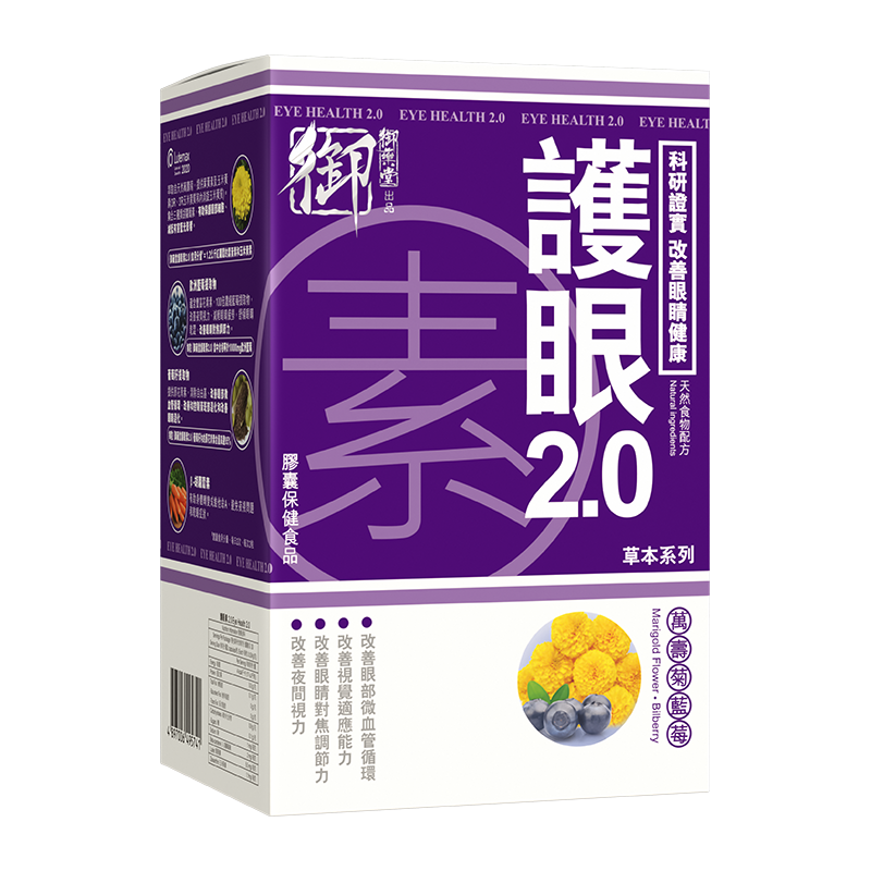 城市人每日要攝取多種護眼食物有困難?御藥堂護眼素 2.0 是你的養眼必備絕佳夥伴,護眼素 2.0主要成分Lutemax 2020採用智慧塗層(smart coating)包封,不被胃酸等破壞,直達腸道發揮效果,原料 100% 全素,不含防腐劑、麩質、人工色素和調味料。經科研實證,這款產品在護眼功效和安全性方面都有優異表現,適合各類人群,有助延緩眼睛退化,舒緩眼澀和眼乾,擊退眼睛紅筋,舒緩眼睛疲勞。護眼素 2.0 還能夠提升視覺敏銳度,改善眼睛模糊,滋養眼睛細胞,並強化黃斑色素的光密度,及減少自由基氧化對視力的侵害。特別適合經常暴露在強光下或長時間使用電子產品的人士,尤其是有老花、深近視或曾做過眼部手術的人士服用。