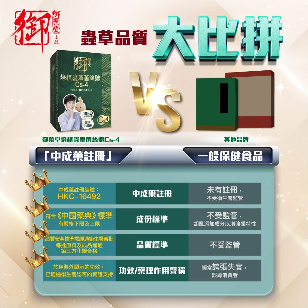 御藥堂是香港第一家培植蟲草 Cs-4 品牌,已有 20 年歷史,絕對稱得上是 「蟲草界專家」,旗下王牌產品《御藥堂培植蟲草菌絲體Cs-4》選用優質培植的冬蟲夏草分離的菌種:蝙蝠蛾擬青霉 (Cs-4),內含 100% 培植蟲草菌絲體,功效非一般培植冬蟲夏草可媲美,同時獲香港中成藥註冊,是市面上罕有中成藥註冊的蟲草保健食品,受衛生署監管,質量更有保證。