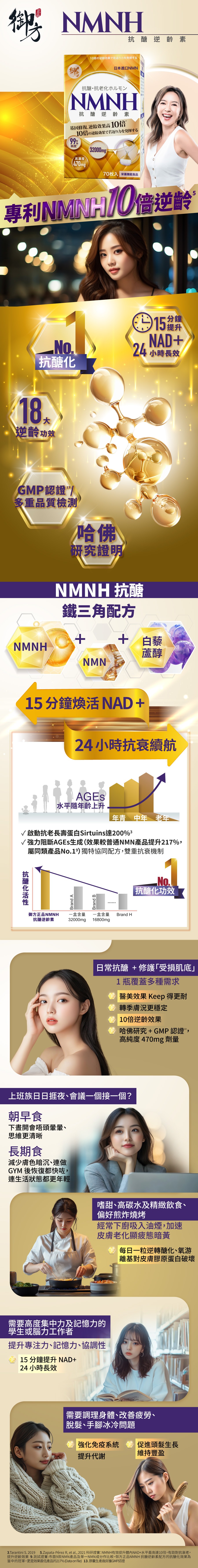 御方正品經多年研究,結合國際醫學文獻研究及美國知名大學教授研究成果,推出最新逆齡配方「NMNH抗醣逆齡素」。產品採用獨有專利NMNH,NMNH是第三代NMN,逆齡效果比一般NMN高10倍。配合超高濃度470mg 日本進口NMN及天然白藜蘆醇,貼近教授建議配方,15分鐘迅速提升NAD+,長效24小時,高效保護激活細胞,全方位鞏固身體機能,強健大腦,改善睡眠質素,讓您重回年輕巔峰狀態,時刻保持活力,輕鬆迎接生活中各種挑戰。