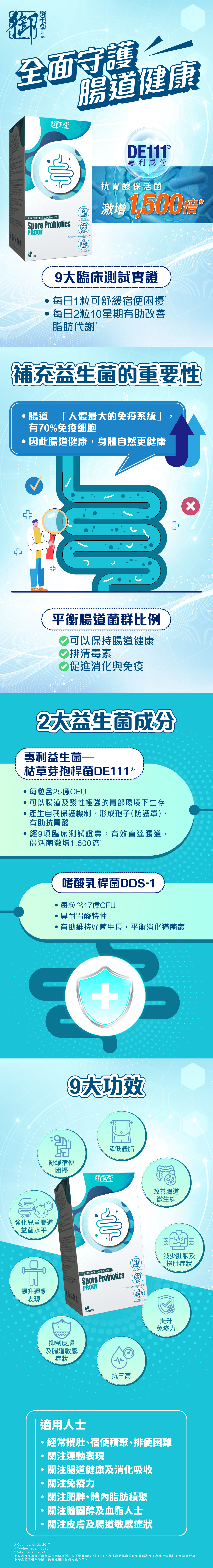 - 含獨特孢子菌DE111專利成份,能產生自我保護機制,形成孢子(防護罩)有助抗胃酸,保活菌激增1,500倍1