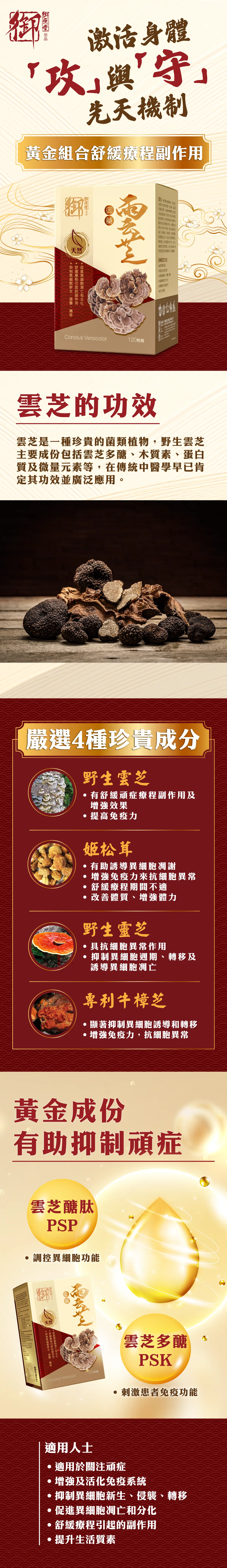 御藥雲芝嚴選4種珍貴成分,精煉成相得益彰的黃金組合,源源不絕地為身體提高活力能量,激活身體「攻」與「守」的先天機制,雙效全面活化身體。專針對頑症人士,舒緩療程副作用,提升患者生活質素。
